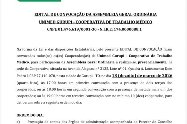 A Unimed Gurupi – Cooperativa de Trabalho Médico convoca todos os cooperados para a Assembleia Geral Ordinária marcada para 18 de março de 2026, quarta-feira, na sede da entidade, localizada na Avenida Alagoas, nº 2125, Lote nº 01, Quadra A, Loteamento Dom Pedro I, CEP 77.410-070, em Gurupi-TO. Conforme o edital, a reunião ocorrerá presencialmente…