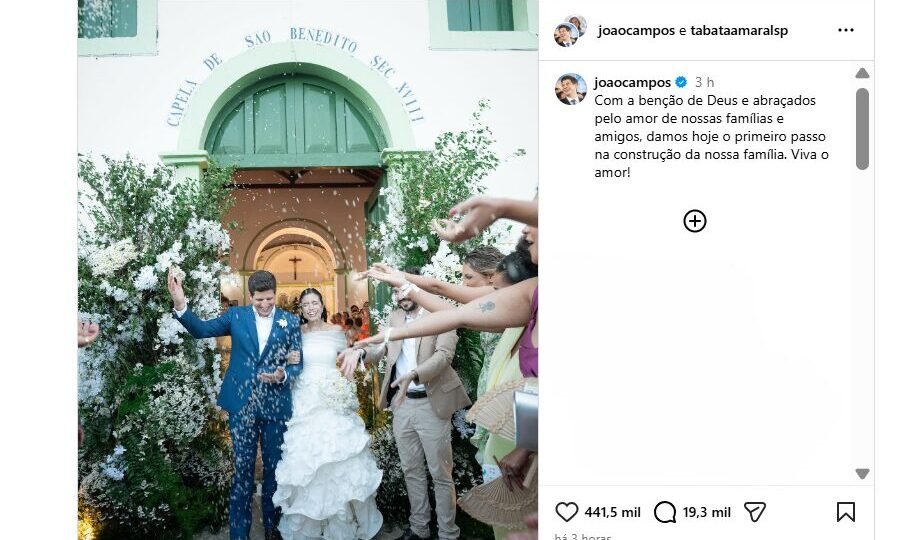 O prefeito do Recife, João Campos (PSB), e a deputada federal Tabata Amaral (PSB-SP) se casaram neste sábado, 21 de fevereiro de 2026, na Capela de São Benedito, localizada na Praia de Carneiros, em Tamandaré (PE). A cerimônia reuniu o vice-presidente Geraldo Alckmin (PSB) e o ministro Alexandre de Moraes, do Supremo Tribunal Federal.