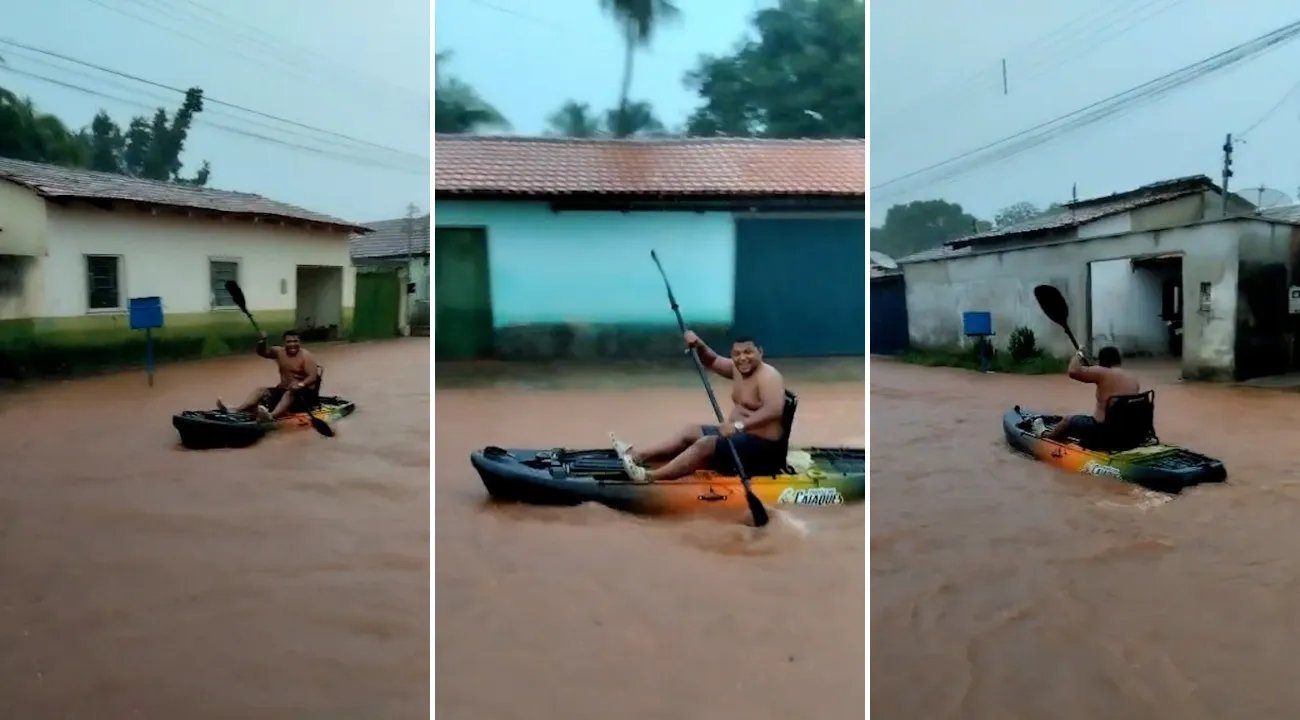 Um servidor público percorreu de caiaque a Rua Dona Joaninha, em Caseara, região oeste do Tocantins, depois da forte chuva registrada no fim de semana. A cena foi gravada no domingo (4), quando a via, localizada na parte mais baixa da cidade, ficou coberta pela enxurrada.