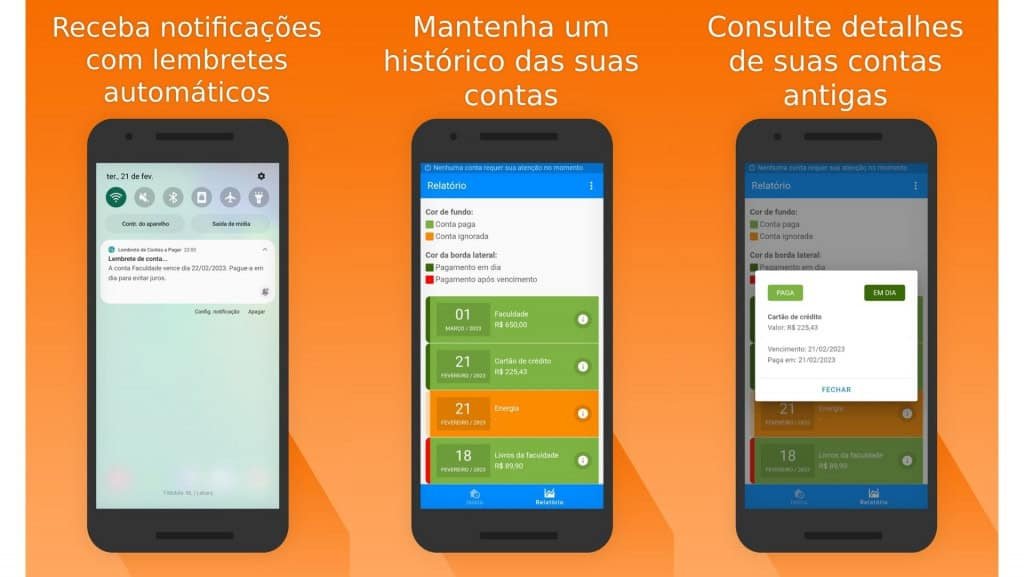 O primeiro aplicativo destacado permite registrar nome da conta, valor, data de vencimento e outros detalhes. O sistema organiza os compromissos em categorias como “atrasadas”, “vencendo hoje” e “pagas”. Enquanto o pagamento não é confirmado, notificações continuam sendo enviadas. A plataforma aceita número ilimitado de lançamentos, datas fixas ou variáveis, mantém histórico completo e é oferecida gratuitamente na Play Store.