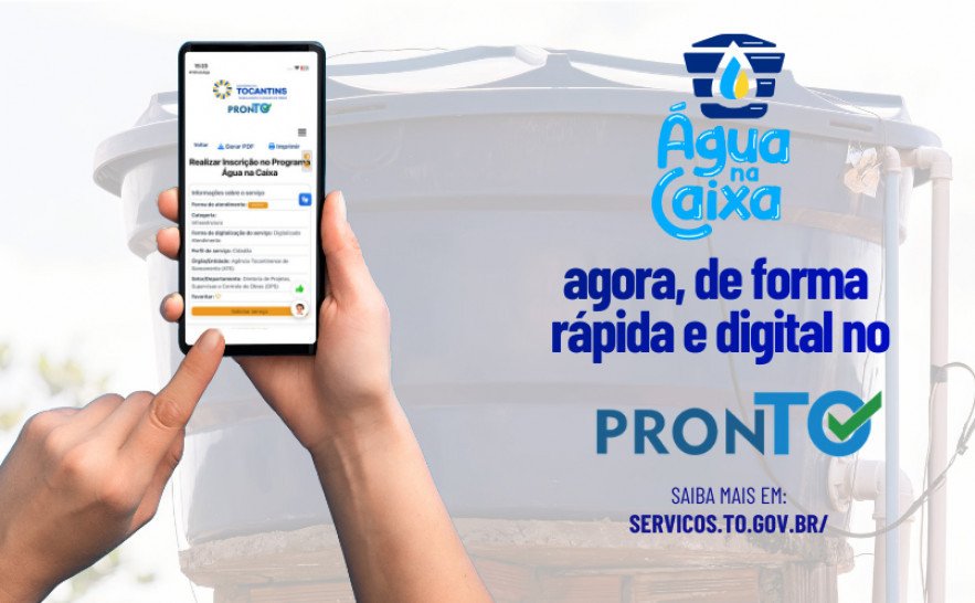 O Governo do Tocantins passou a oferecer, pelo Portal de Serviços do Tocantins, o processo digital de inscrição no programa Água na Caixa. A plataforma foi desenvolvida pela Agência de Tecnologia da Informação do Tocantins (ATI) em parceria com a Agência Tocantinense de Saneamento (ATS).